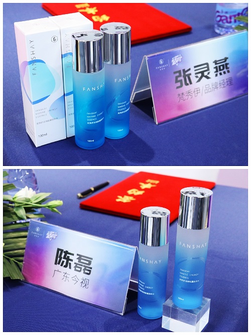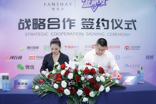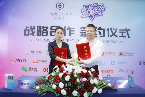 双方致辞完后,梵秀伊代表张灵燕女士与《OMB我是你的蓝朋友》节目代表陈磊先生在众多媒体以及梵秀伊美肤顾问团队、粉丝的共同见证下,共同签字,相互握手,正式达成战略合作。