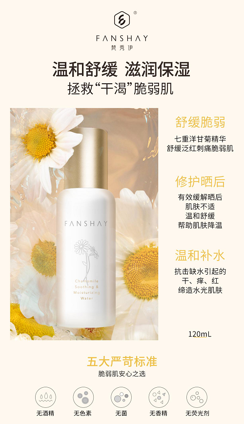 梵秀伊洋甘菊舒缓润颜纯露,长期使用可提升肌肤自身修护力,精心甄选7重洋甘菊精华,抗敏植物精粹,卓效改善面部干燥、粗糙,令肌肤健康舒润,畅享舒悦安肌之感。让我们一同周海媚健康护肤,温柔守护肌肤水润光泽,释放出美丽无瑕自然美肌!